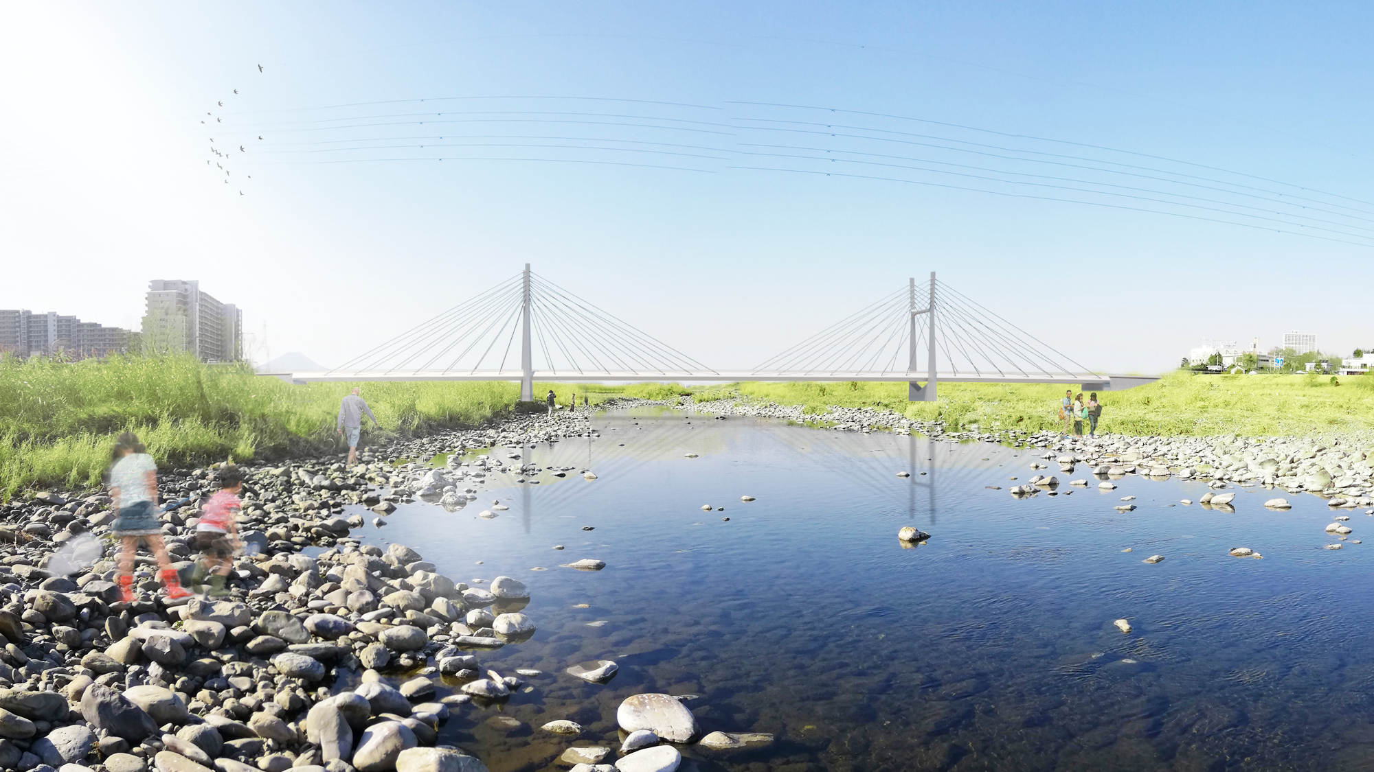 先行して計画されていた斜張橋の設計を、質の高いものにアップグレードするプロジェクト。多摩川の開放感ある河川敷と、富士山、高尾山、景信山などの山並みに調和することをコンセプトに、力の流れに沿った無駄のないシンプルなケーブル定着ディテール、主塔と橋脚をシームレスに接合するディテール。高欄、耐風フェアリングを兼ねた主桁形状は、汚れのたまりにくいシームレスな面の造形によりメンテナンスに配慮しつつ、要求機能を満たすための要素を最小限にし、河川風景に対し開放的な橋上空間を実現している。エンジニアリングをベースに洗練されたディテールを積み上げることだけでも、十分に見たことない存在感の橋を実現することが可能となる。メインスパン165m橋長330mの道路橋。
