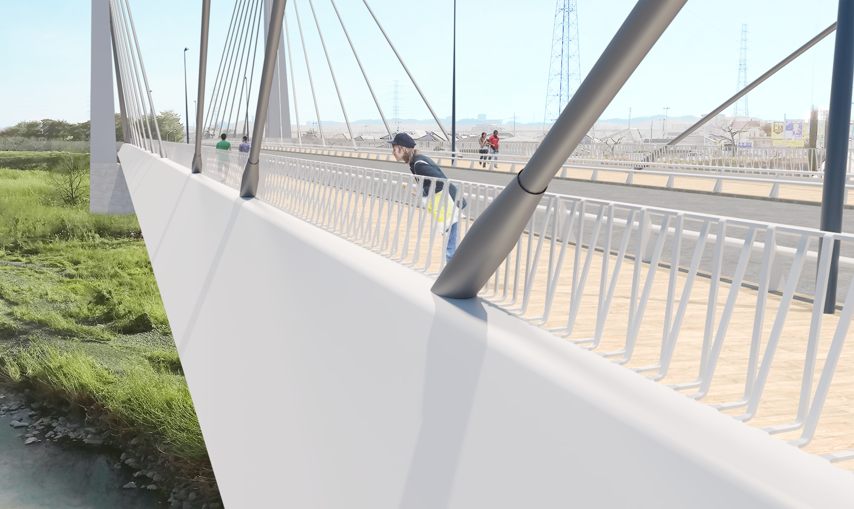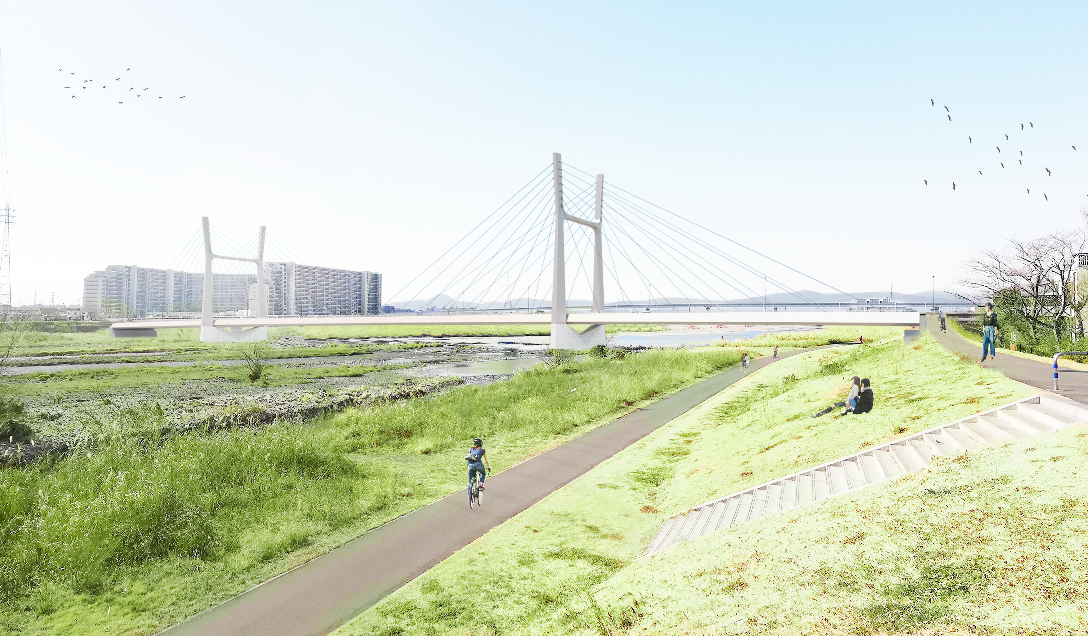 This project aimed to upgrade the previously planned cable-stayed bridge to a higher-quality design. The concept focused on harmonizing with the open riverside of the Tama River and the surrounding mountain ranges, including Mount Fuji, Mount Takao, and Mount Kagenobu. Through refined details—such as streamlined cable anchoring that follows the flow of forces, seamless connections between the towers and piers, The shape of the main girder, which integrates the functions of a railing and wind-resistant fairings, features a seamless surface design that reduces maintenance needs. By minimizing the required structural elements while fulfilling functional demands, the design achieves an open bridge deck space that maintains visual continuity with the river landscape. A high-quality bridge can be achieved through the integration of refined, engineering-driven details. The bridge is a 330-meter-long road bridge with a main span of 165 meters.